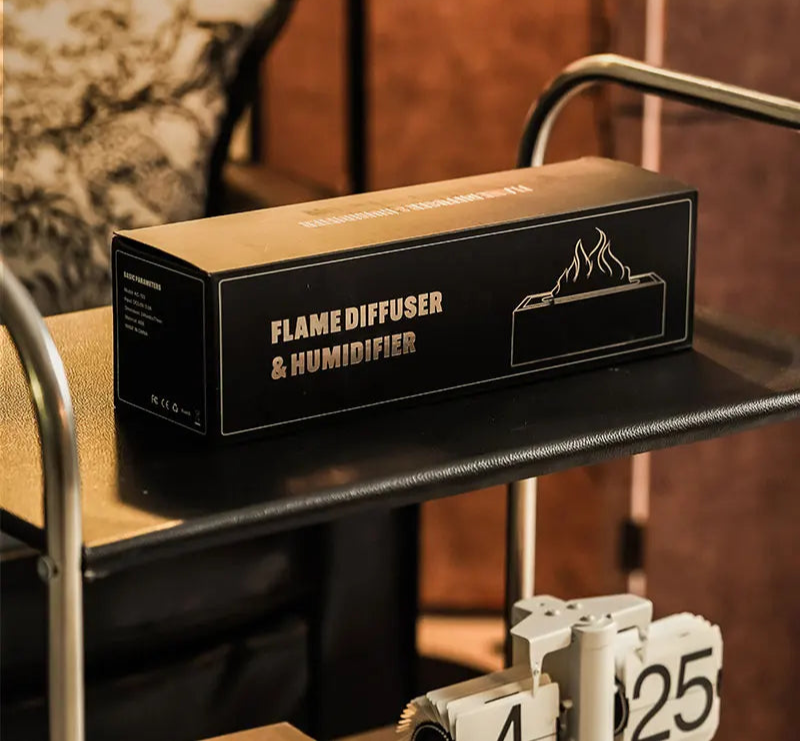 The upgraded packaging of our flame aromatherapy diffuser sets it apart from the rest. With its eye-catching silver foil accents on a sophisticated black background, this diffuser makes a statement as a thoughtful gift for any occasion.
